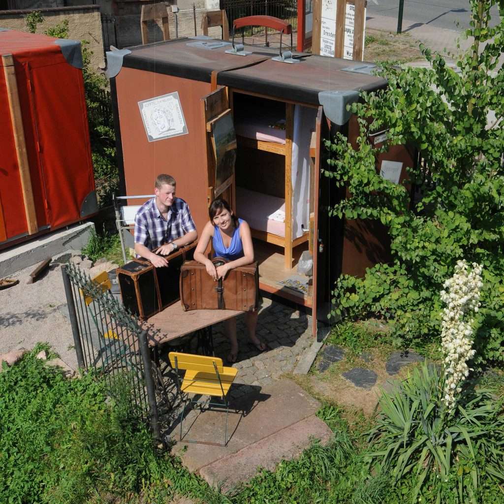 Wohnen im Koffer-Hotel. (Foto: Prellbock Bahnart)