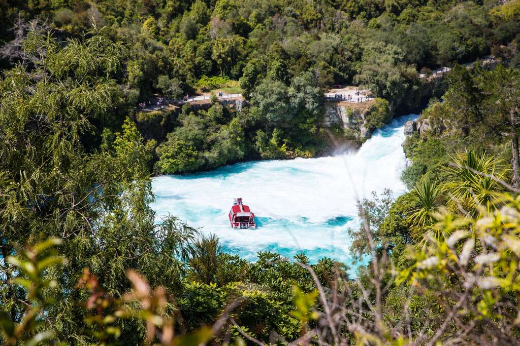 Bis zu 270.000 Liter Wasser pro Sekunde schießen durch die zwei Kaskaden des Huka Falls und zeigen einem auf eindrucksvolle Art und Weise die Kraft der Natur. Die Wasserfälle des Waikato Rivers sind wahrlich atemberaubend. Eigentlich fließt der Fluss ganz gemütlich auf einer durchschnittlichen Breite von 100 Metern durch das landschaftlich wunderschöne Taupo District in der Region Waikato auf der Nordinsel von Neuseeland. Doch an den Huka Falls verengt sich der River auf eine 15 Meter schmale Stromschnelle und schießt zunächst einen acht Meter und dann einen elf Meter tiefen Abgrund herunter. Lange galten die Wasserfälle als unbefahrbar. Erst 1981 wurden sie von zwei Kajakfahrern bezwungen. Wer dem unteren Wasserfall ganz nah kommen will, kann eine Tour mit dem Jetboot buchen. Alle, die die Umgebung ruhiger genießen wollen, sei ein ausgiebiger Spaziergang auf dem traumhaften Wanderweg auf der östlichen Seite des Flusses empfohlen.