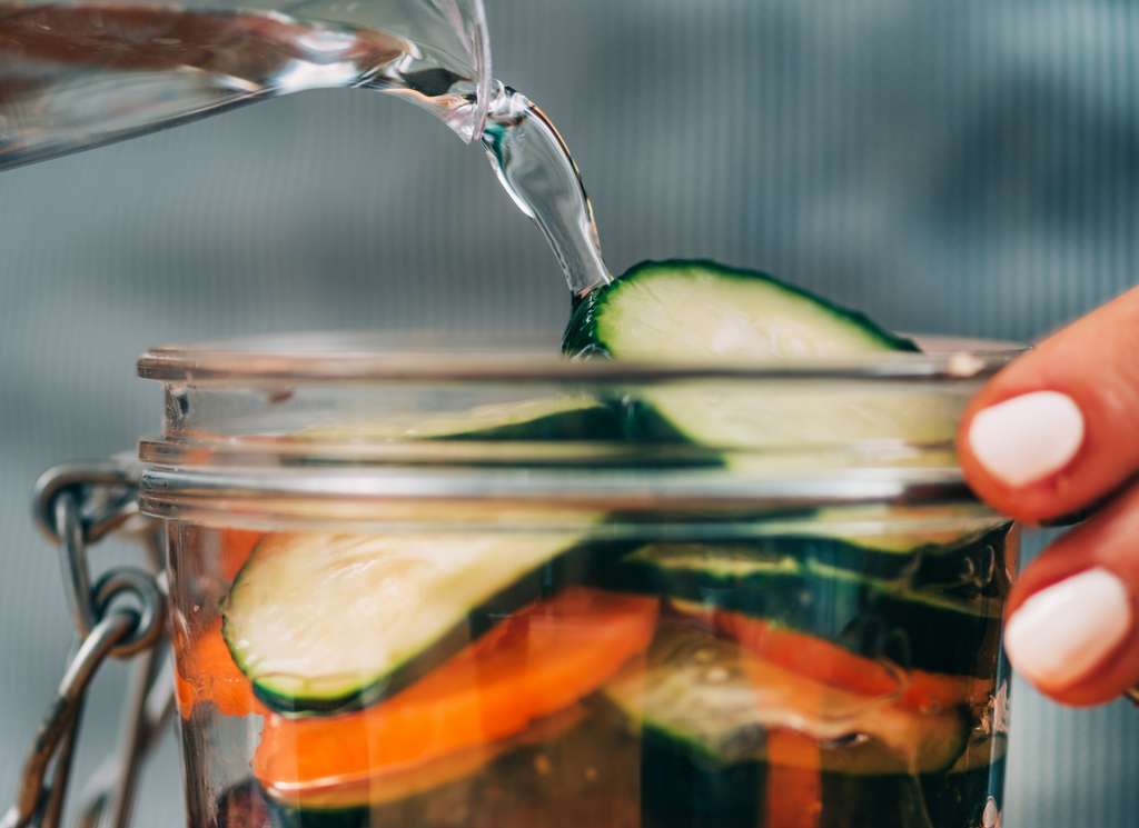 Das saure Einlegen, im Englischen „to pickle“, ist besonders einfach. Dazu zerkleinertes Gemüse roh in sterilisierte Gläser geben und mit einem heißem Sud aus einem Teil Essig, zwei Teilen Wasser, Zucker (etwa 20 g auf 1 l Wasser), Salz (etwa 30 g auf 1 l Wasser, kein Jodsalz verwenden!) sowie je nach Geschmack Gewürzen und Kräutern aufgießen. Wichtig: Das Gemüse ganz mit Sud bedecken. Die Gläser fest verschließen, auskühlen lassen und das Gemüse einige Wochen an einem dunklen, trockenen Ort reifen lassen. Es hält gut zwei Monate. Nach dem Öffnen im Kühlschrank aufbewahren und bald verbrauchen. Sauer eingelegtes Gemüse schmeckt gut zum Abendbrot, etwa zu Käse und Schinken.
