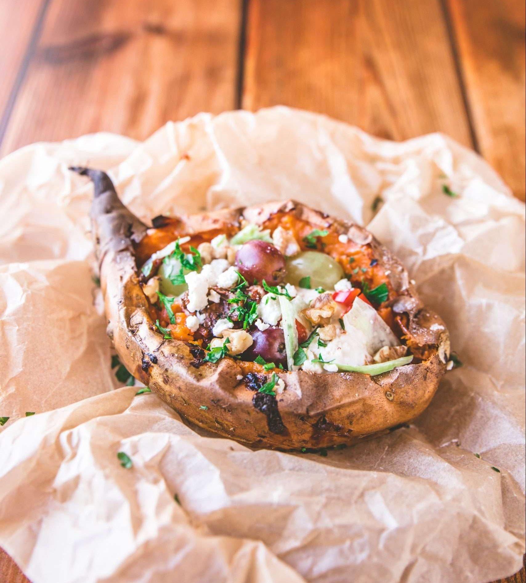 SÜßKARTOFFEL-KUMPIR MIT WEINTRAUBEN & FETA