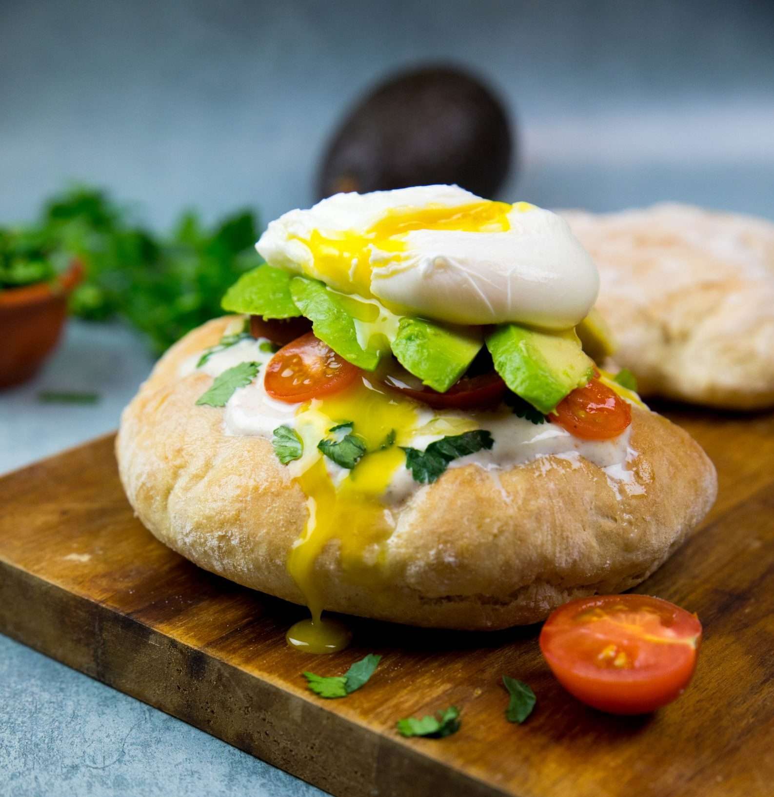PITABROT MIT POCHIERTEM EI, AVOCADO UND JOGHURT-SALSA
