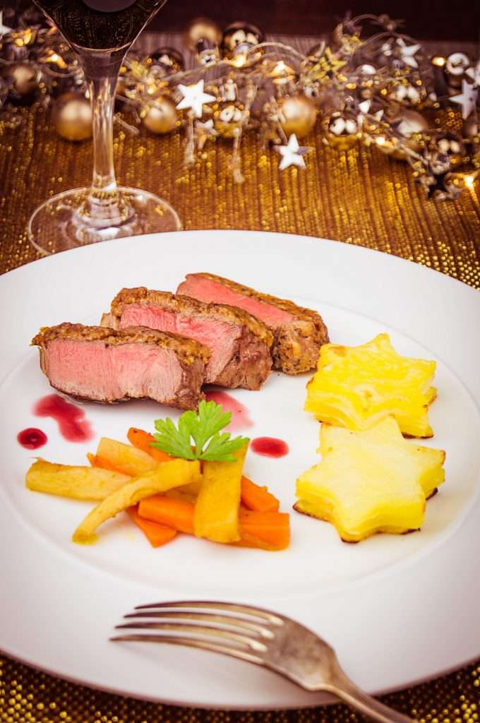 US-BEEF MIT SCHOKOLADEN-NUSS-KRUSTE AN ROTWEINSAUCE, GRATINSTERNEN UND HONIG-MÖHREN