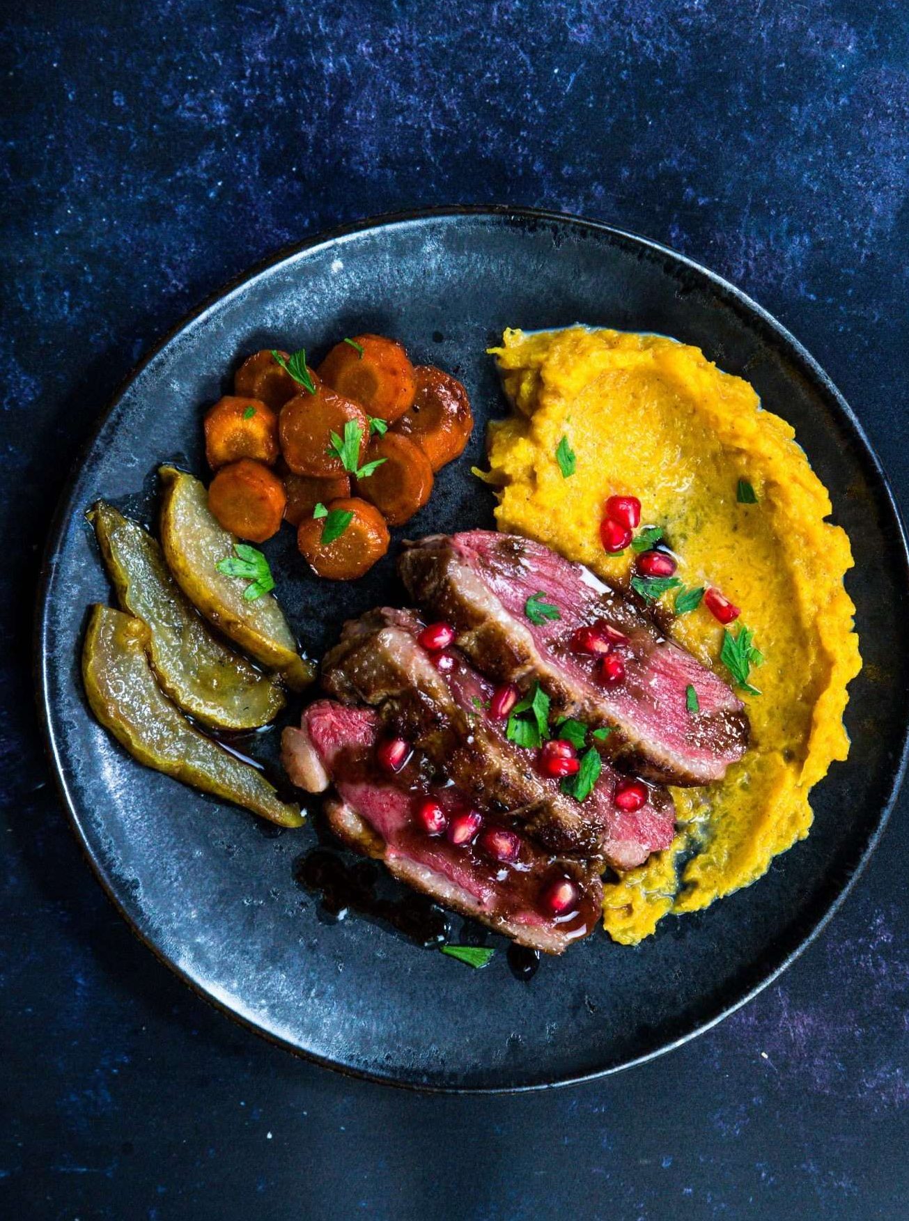 ENTENBRUST MIT GRANATAPFEL-GLASUR AUF KÜRBIS-PÜREE, BIRNEN UND MÖHREN