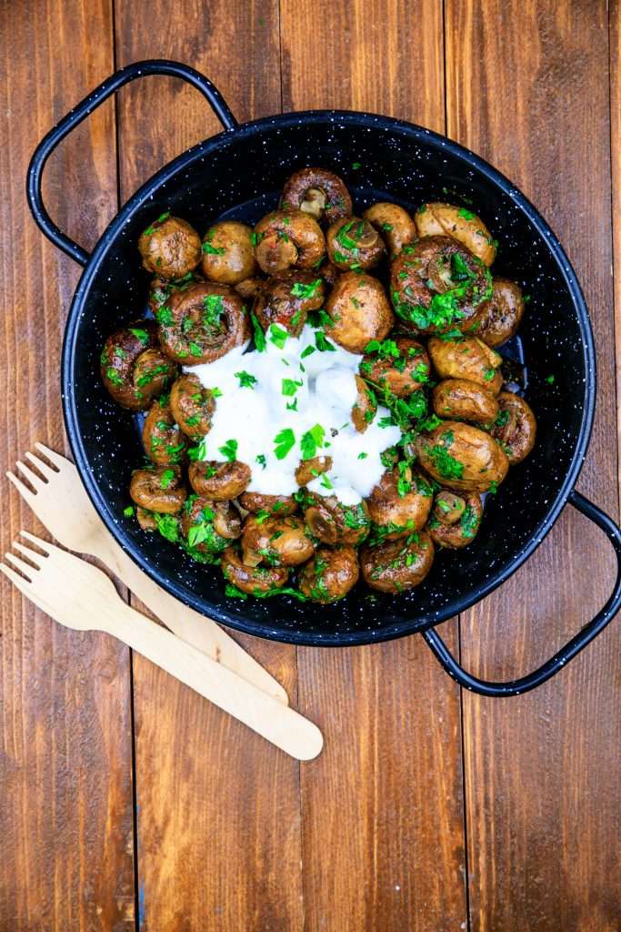 Ein Klassiker auf dem Weihnachtsmarkt - nicht nur für Vegetarier: würzige Champignon-Pfanne mit leckerem Kräuter-Dip. Und diese Köstlichkeit kannst Du jetzt mit unserem Rezept ganz einfach zuhause zubereiten.