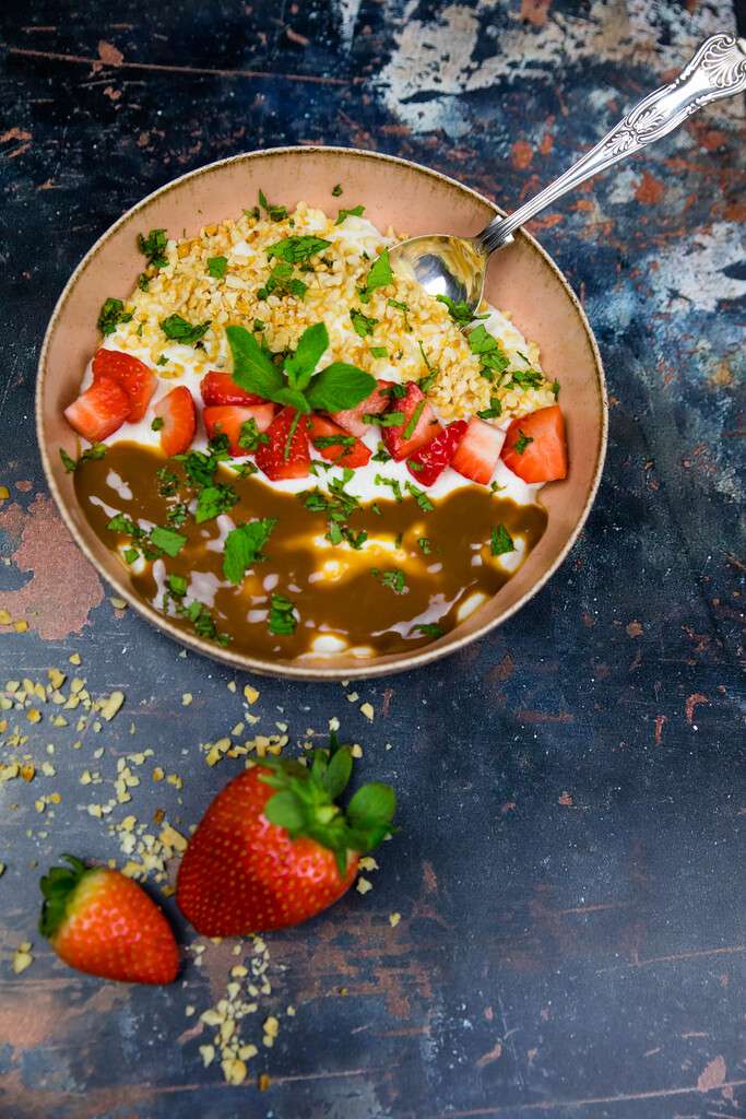 Das kommt mir in die Schüssel: Unsere Erdbeer-Grieß-Bowl wird mit süßer Dulce de Leche verfeinert. Die Creme ist besonders in Spanien sehr beliebt und wird für viele Desserts oder auch als Brotaufstrich verwendet.