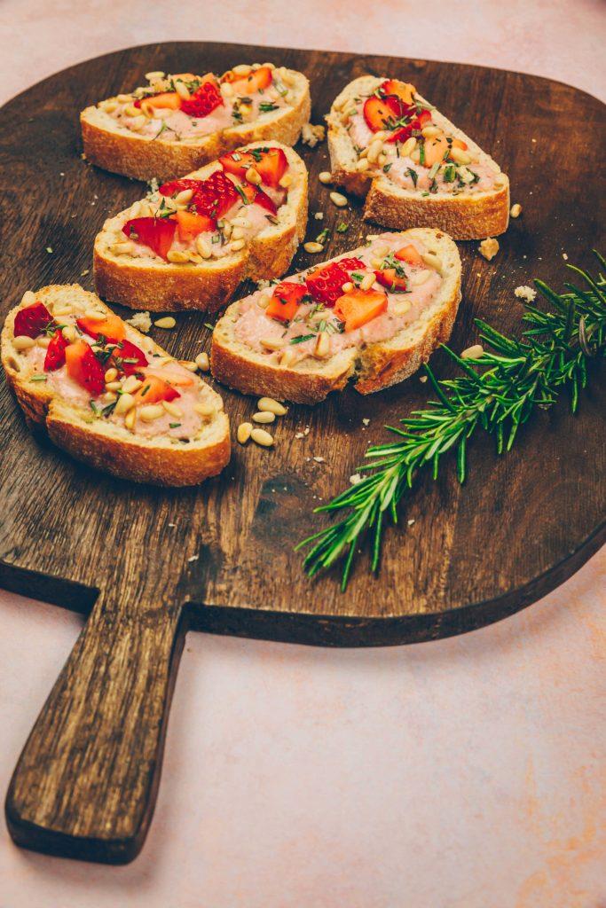 Frühling auf dem Brot! Cremiger Ziegenfrischkäse mit fruchtigen Erdbeeren, gerösteten Pinienkernen und aromatischem Rosmarin auf einem knusprigem Ciabatta Brot – guten Appetit.