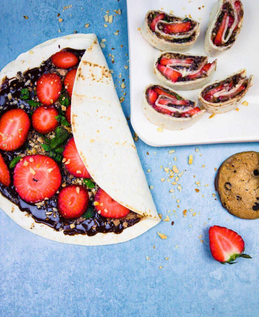 Für den Start in den Morgen oder den Snack am Nachmittag: Erdbeer-Wrap-Röllchen mit Schokolade, Mandeln und Minze. Yummy!