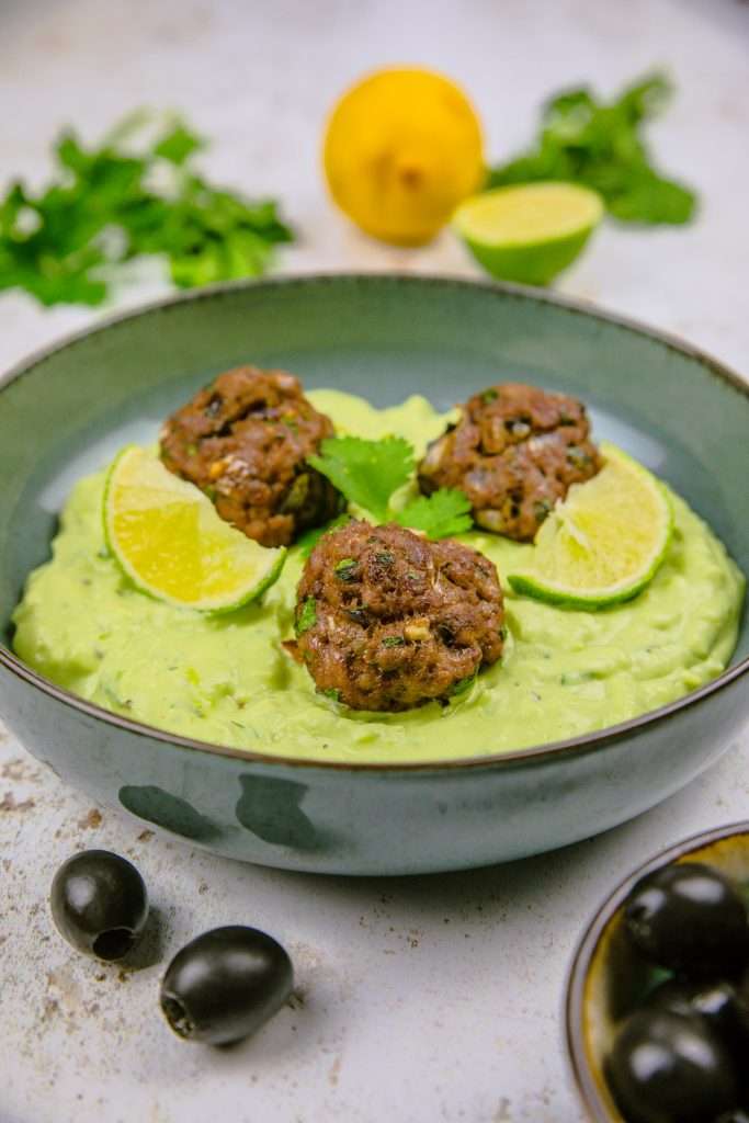 HACKBÄLLCHEN-BOWL MIT AVOCADO-TSATSIKI