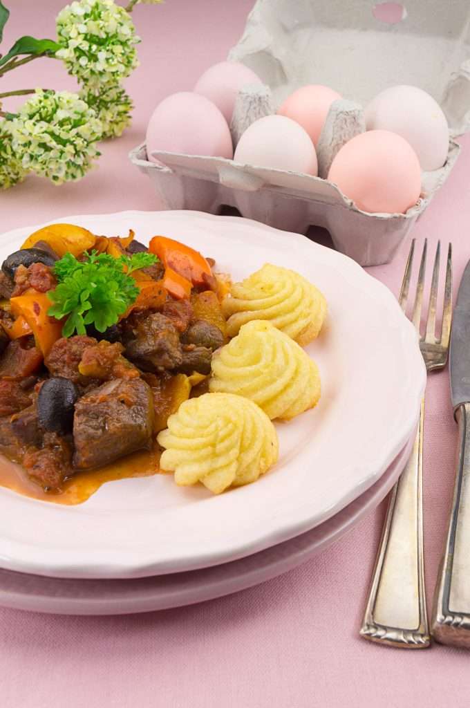 In der Zwischenzeit die Oliven halbieren. Die Paprika waschen, entkernen und in große Stücke schneiden. Beides in die Pfanne geben und für zirka weitere 15 Minuten köcheln lassen, bis die Sauce eingedickt und das Fleisch gar ist.