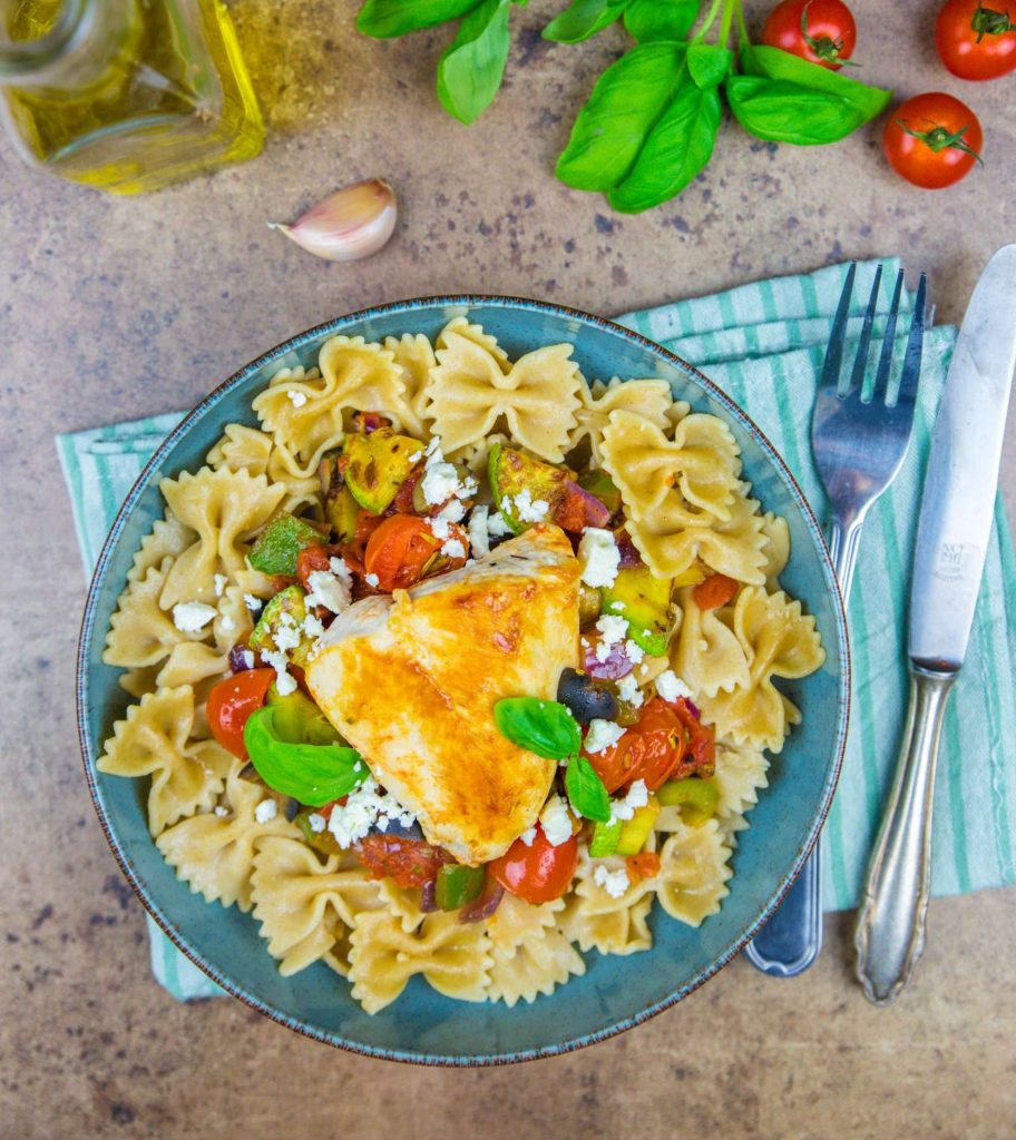 Schmeckt wie im Urlaub am Mittelmeer: leckeres Hähnchenfilet auf Tomaten-Kräuter-Gemüse und Vollkorn-Pasta. Einfach köstlich!