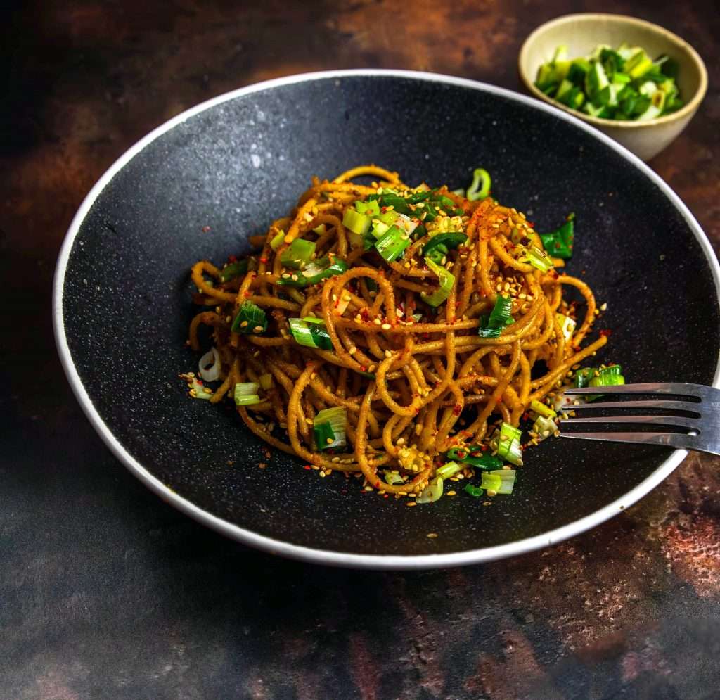 In einer Pfanne das Olivenöl erhitzen und die Frühlingszwiebeln 2 Minuten braten. Die Nudeln hinzufügen und kurz mit anbraten.