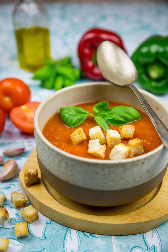 Die Gazpacho mit Salz, Pfeffer, Kreuzkümmel und Paprikapulver würzen und anschließend mindestens zwei Stunden kaltstellen. Die Gazpacho noch einmal abschmecken. Nach Belieben mit Brot-Croutons, frischem Basilikum garnieren und kalt servieren.