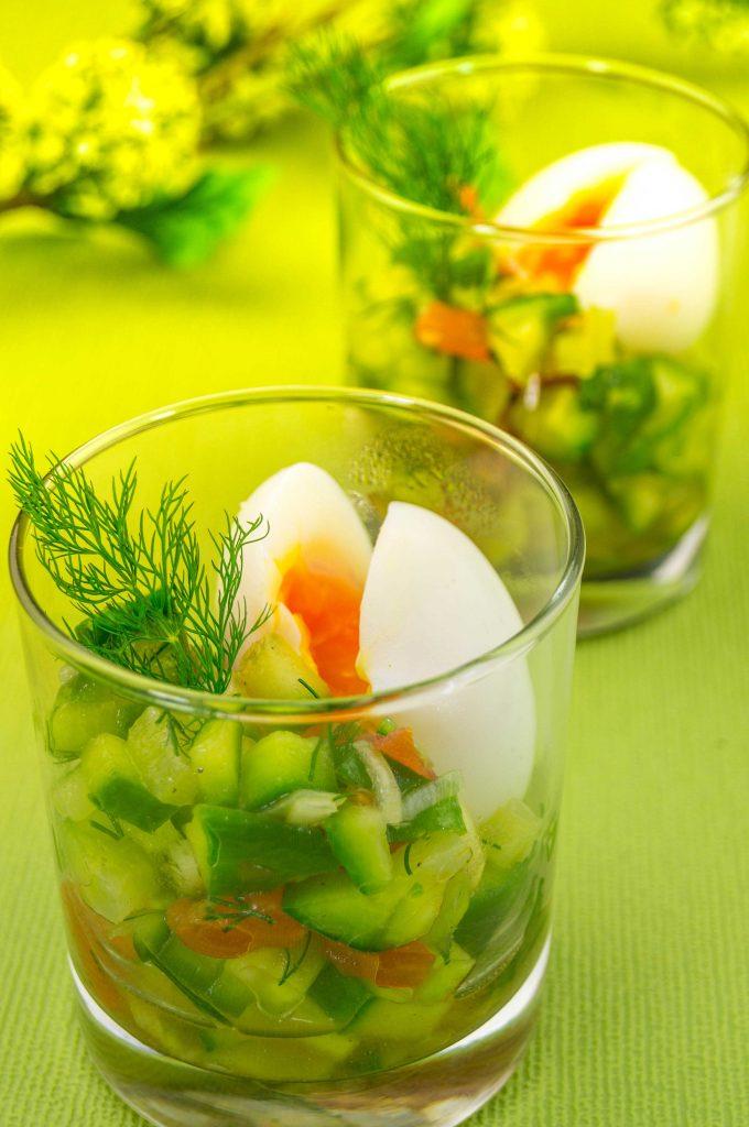 Die Salsa in 4 Gläser verteilen und je ein Ei in ein Glas geben. Vorsichtig das Ei von oben einschneiden, so dass das Eigelb sichtbar wird. Alles noch einmal salzen und mit den restlichen Dillspitzen servieren.