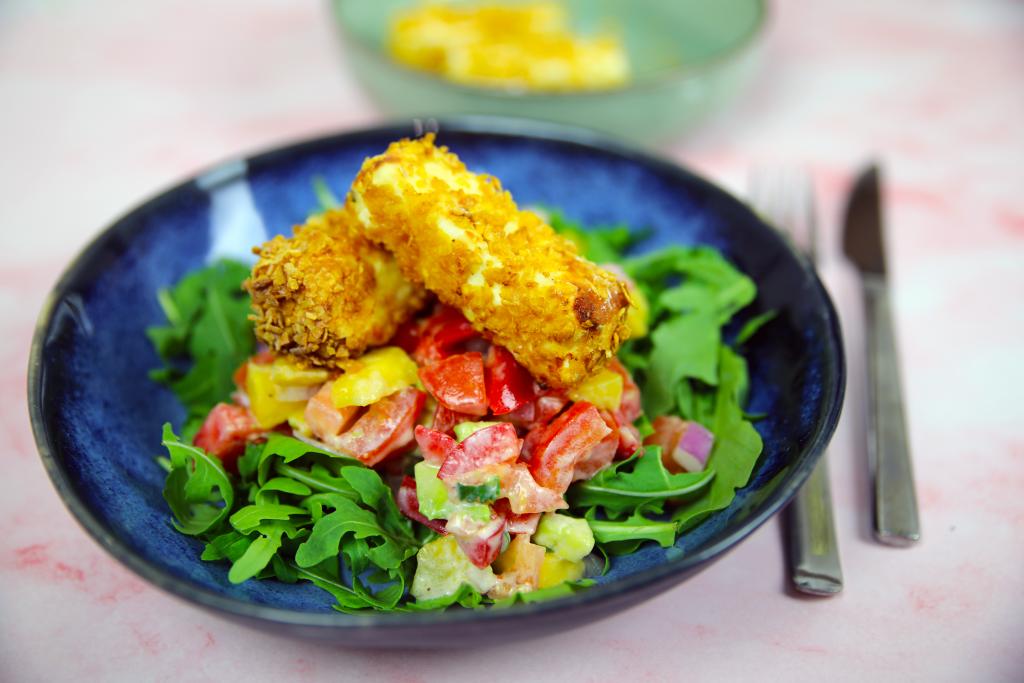 So crunchy kann Feta sein: Probiert Rinas Feta-Sticks mit einer knusprigen Cornflakes-Panade mit Erdbeer-Mango-Salsa auf Rucola-Salat. Ohne zusätzliches Frittierfett – denn die Sticks kommen aus dem Airfryer.